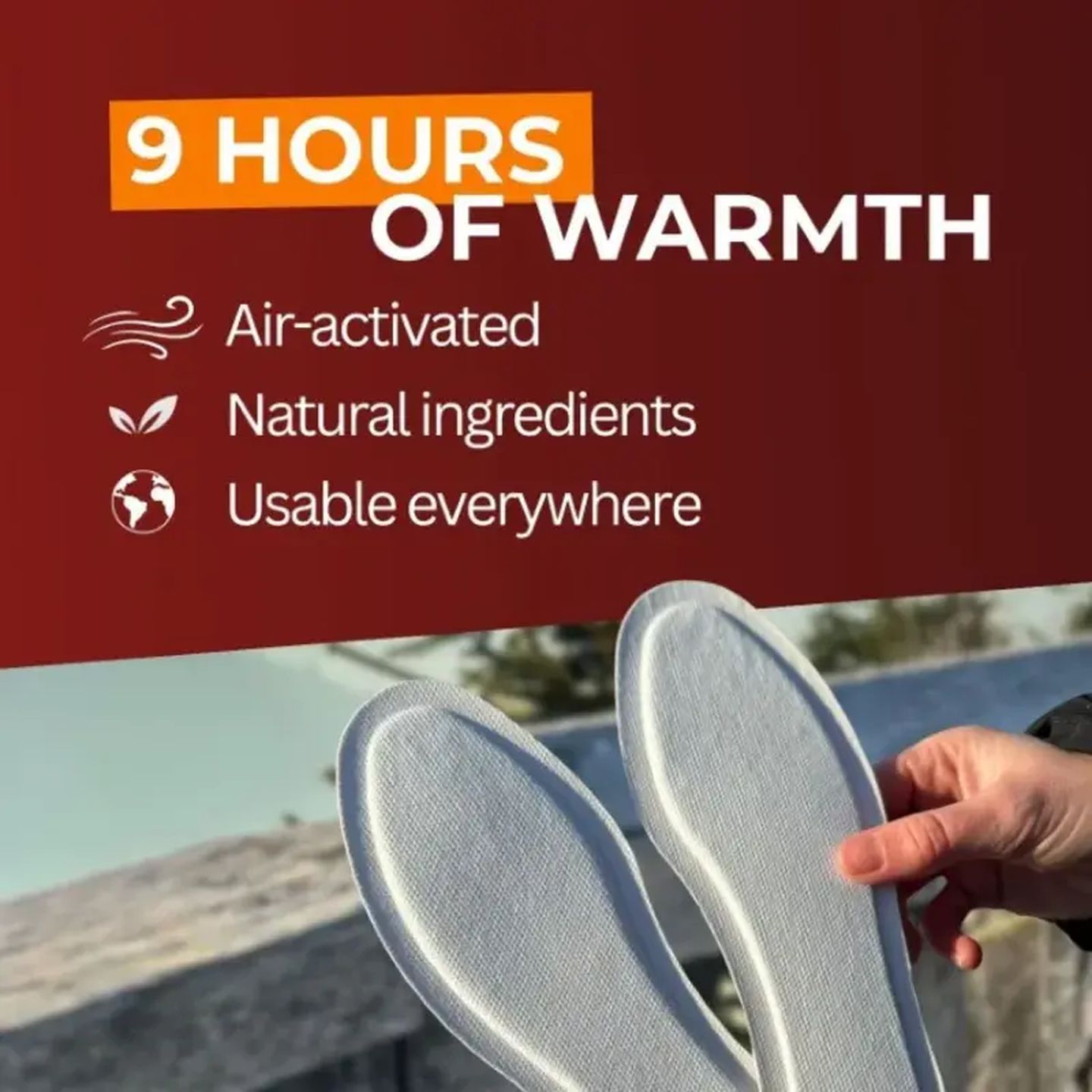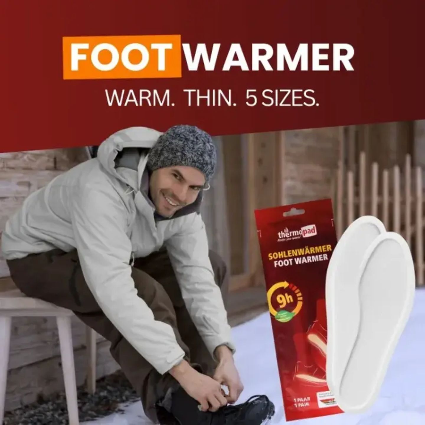 The air-activated sole warmers (insoles) heat up automatically after removing the packaging. They are considered a top product for skiing or in the stadium, but are also used by many people in everyday life. The warming insoles fit into any (ski) boot. After opening, insert the warmers directly into the boots and put them on. They develop an average temperature of approx. 37°C for up to 8 hours. Various sizes available: