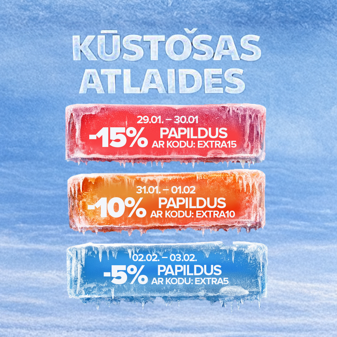 - -15% papildus ar kodu: EXTRA15. Piedāvājums ir spēkā no 2026 01 29 līdz 2026 01 30.