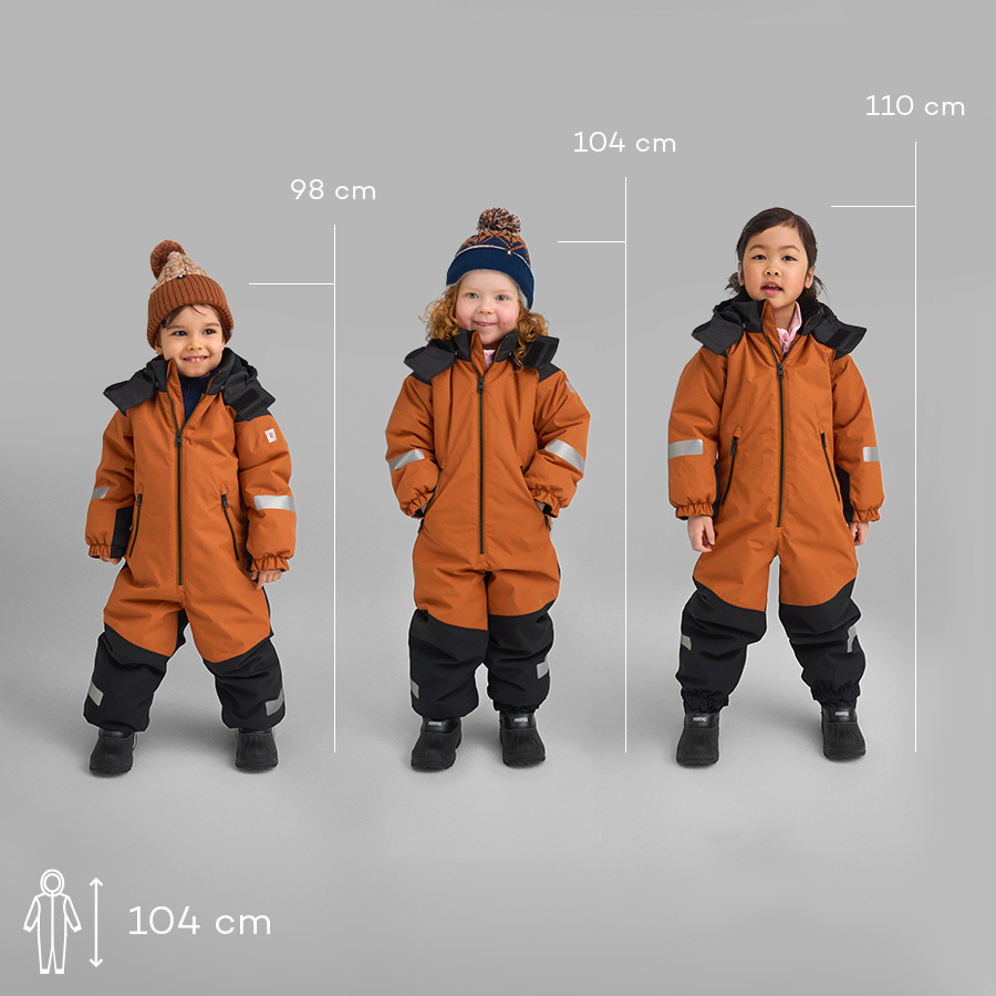 Reima apģērbiem ir aptuveni 6 cm izaugšanas rezerve, tāpēc tos ir ērti valkāt kopā ar apakšējo un vidējo slāni. Ja jūsu bērns rudenī ir aptuveni 104 cm augsts un ir slaidas vai vidējas miesasbūves, 104 cm izmēra kombinezons būtu piemērots visai ziemai. Tomēr bērni var negaidīti izaugt, tādēļ dažreiz ir prātīgi izvēlēties lielāku izmēru. Attēlā redzams, ka visi bērni valkā viena izmēra (104 cm) kombinezonu – bērns pa kreisi ir 98 cm, vidējais - 104 cm, bet labajā pusē - 110 cm.