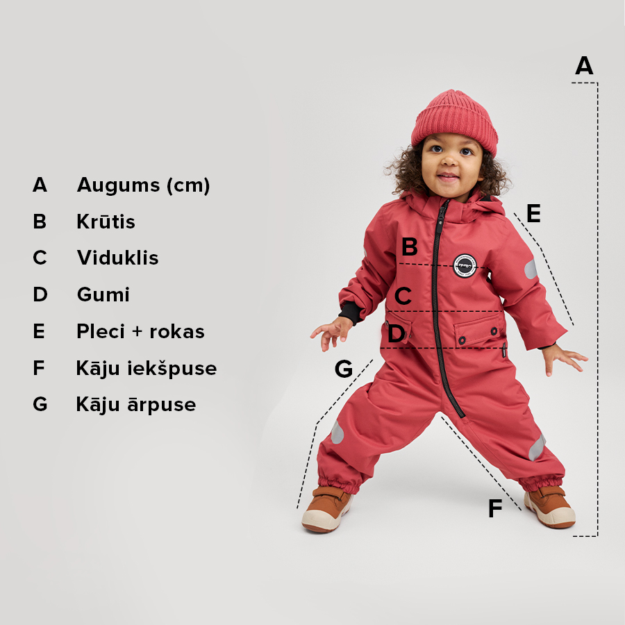 Iesakām pielaikot apģērbus, jo dažādi modeļi var atšķirties – REIMA kolekcijā atradīsiet gan brīvākus, gan pieguļošākus apģērbus. Turklāt katra bērna ķermeņa uzbūve ir unikāla. Lūdziet bērnam pietupties: kombinezona mugurpusē nedrīkst būt par ciešu – starp kaklu un kājstarpi jābūt pietiekami daudz brīvības vietas. Lūdziet bērnam pacelt rokas sānis: piedurkņu garums ir piemērots, ja plaukstas joprojām ir nosegtas.