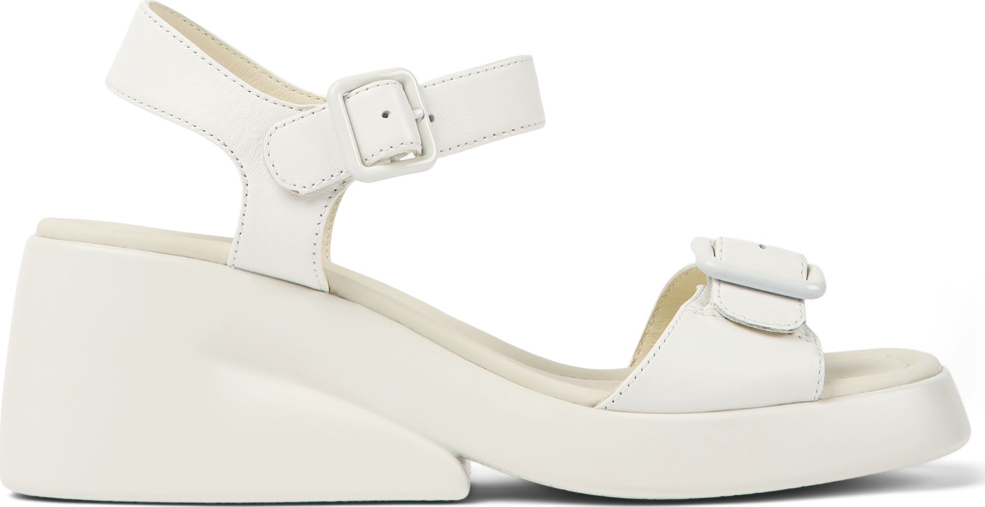 Sandal for women. Open upper with leather strap and ankle strap. Black wedge heel, black outsole, 90% PU and 10% ABS.With a bold, contemporary design inspired by Futurism and Brutalism, our Kaah sandals offer a playful twist on avant-garde style.