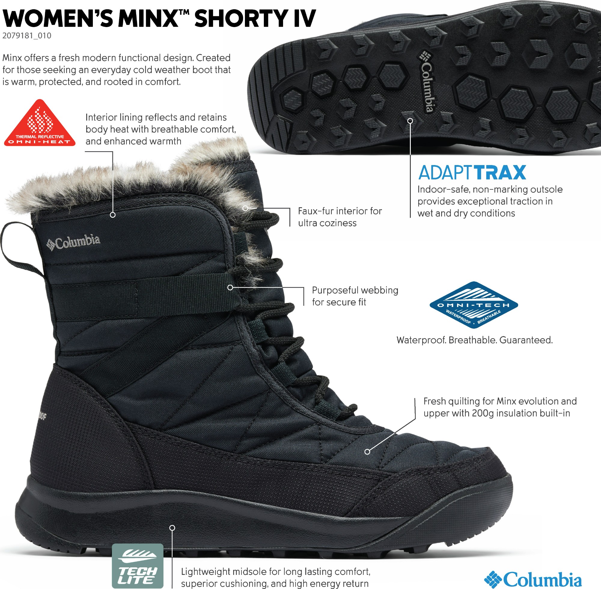 Columbia apavi un apģērbi ir izstrādāti tā, lai pielāgotos dažādiem laikapstākļiem. Pateicoties modernām tehnoloģijām, piemēram, Omni-Tech™ (ūdensnecaurlaidība) un Omni-Heat™ (siltuma saglabāšana), tie palīdz saglabāt siltumu un sausumu pat ekstremālos apstākļos.