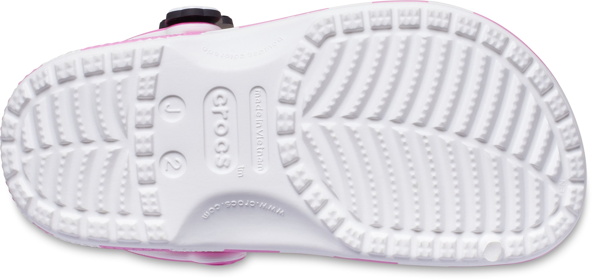Yoo-hoo, it’s the Minnie Mouse Classic Clog from the Disney’s Mickey & Friends collection! This adorable Classic Clog is designed with Minnie’s iconic style in mind, featuring a pink polka dot print topped with a big, pink, glitter bow on each shoe! Minnie Mouse’s face adorns each of the rivets with her signature across the backstrap.