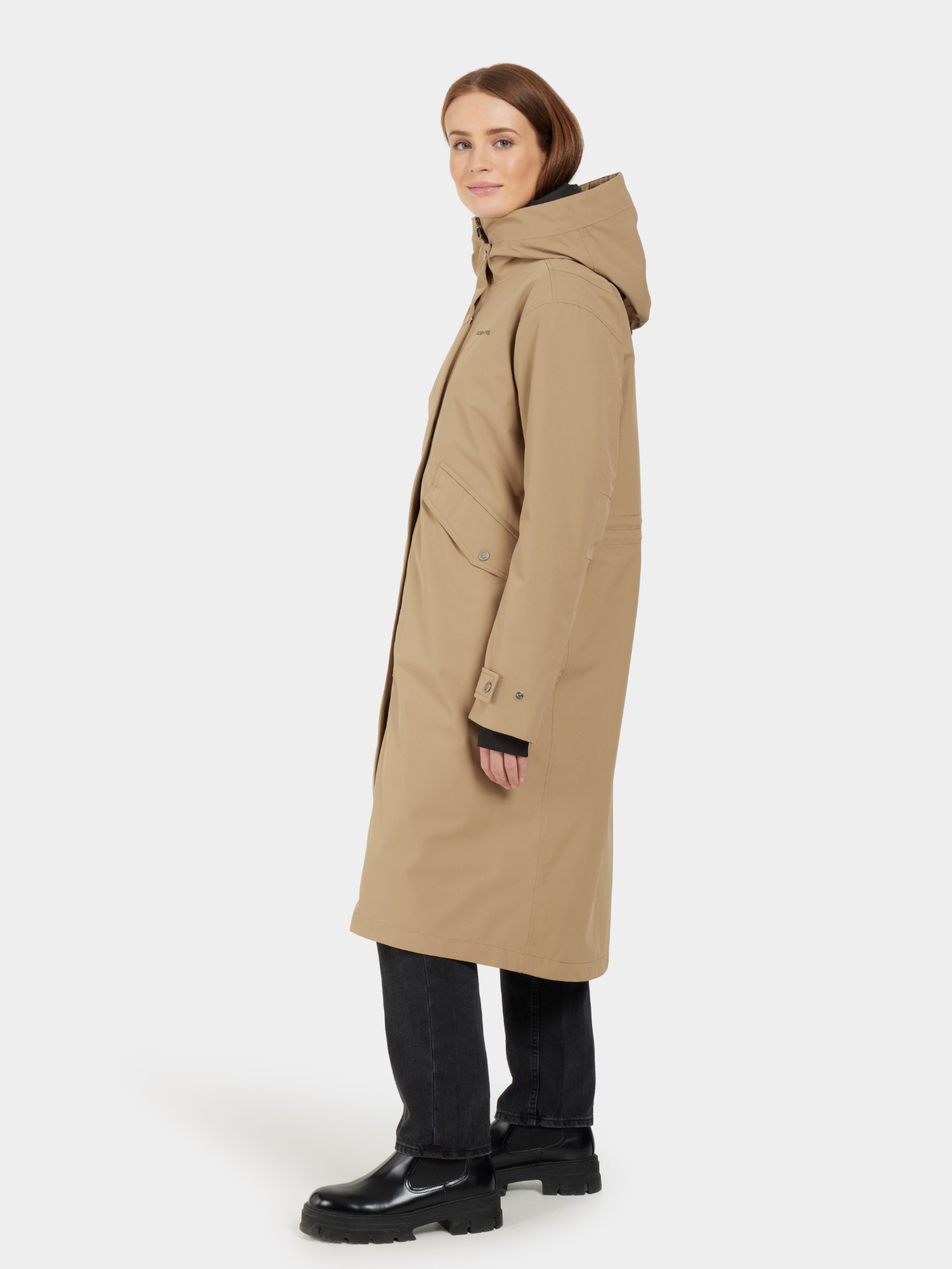 Mia is an long everyday parka with a cosy inside for the cold and rainy days. It is fully waterproof and windproof with all seams taped for extra protection. It has reflective prints on the front chest and back shoulder. A-shaped with three pockets in total. For the black colorway the fabric has been dyed using Solution Dye, a dye technique that saves up to 80% water compared to conventionally dyed polyester/polyamide fabric.