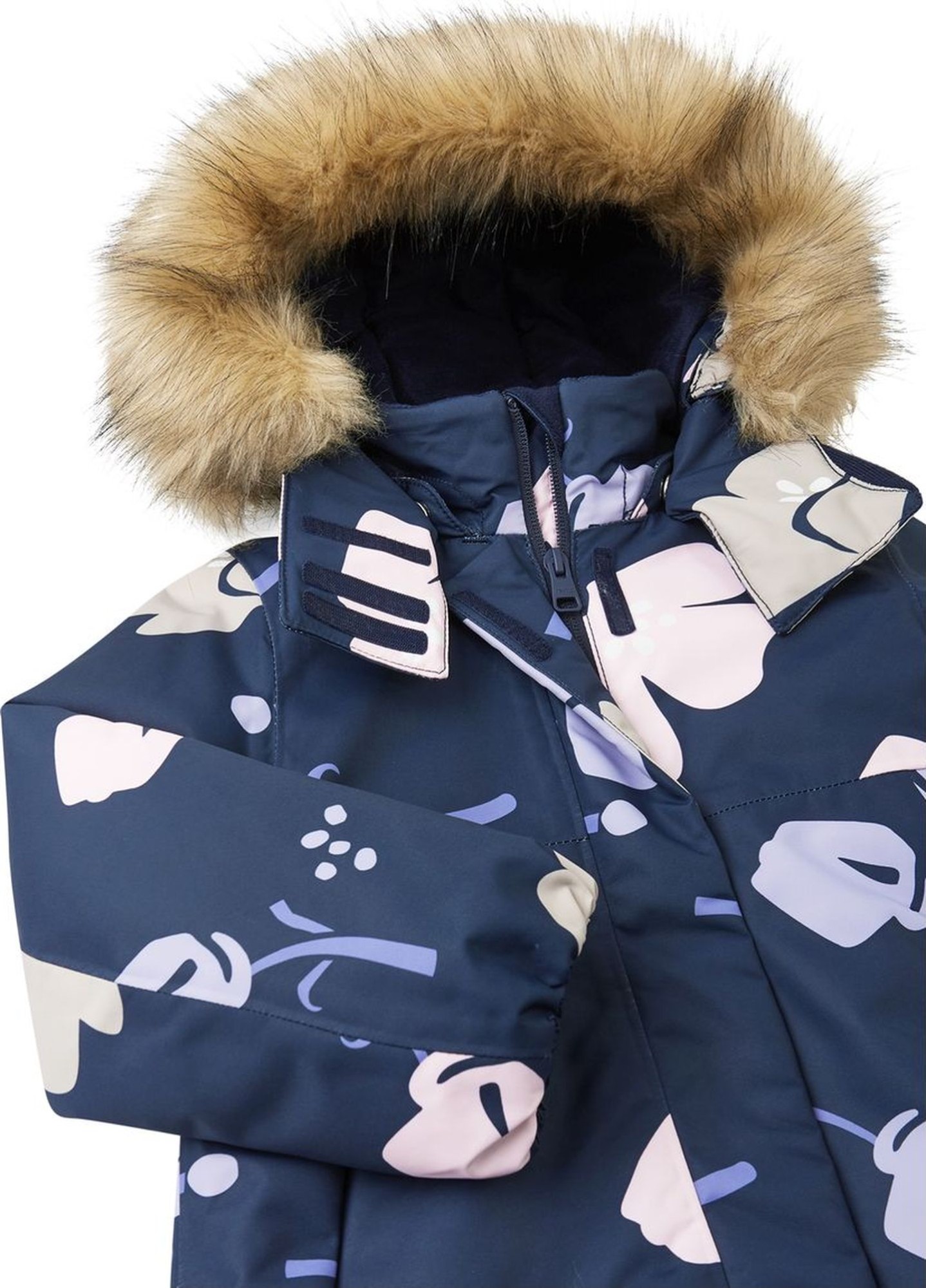 Wash separately inside out. Remove faux fur trim before washing. Close zippers and velcro tapes. Do not use detergents with bleaching agents. Do not use fabric softener. Remove the garment after finished washing program to avoid color change. Tumble drying or drying cabinet allowed (max. 40 °C).