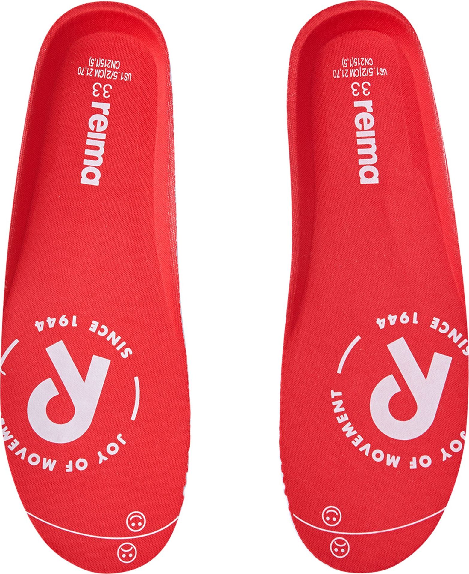 Removable, molded EVA insoles with jersey lining and Happy Fit print help to find the correct size;