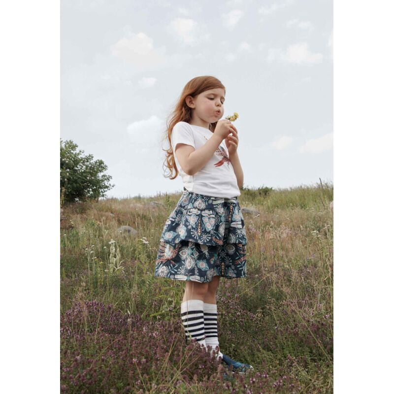 The world of fairy tales is waiting - maybe just behind that tree? Neilikka ruffled kids' skirt is made in Europe using a fine Italian cotton weave. The elastic waist gives room for growth and is comfortable in use. This skirt can be worn on festive occasions, yet goes nicely with casual tops for daily wear.