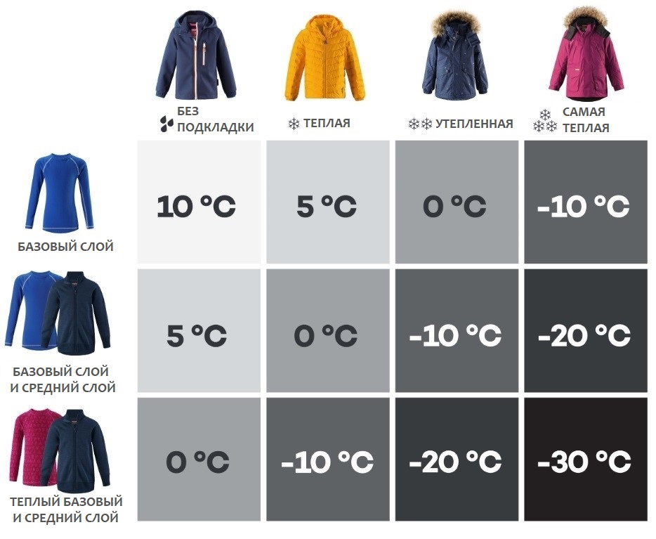 Рекомендуемая температура зависит от того, как вы чередуете слои одежды (см. Таблицу):
